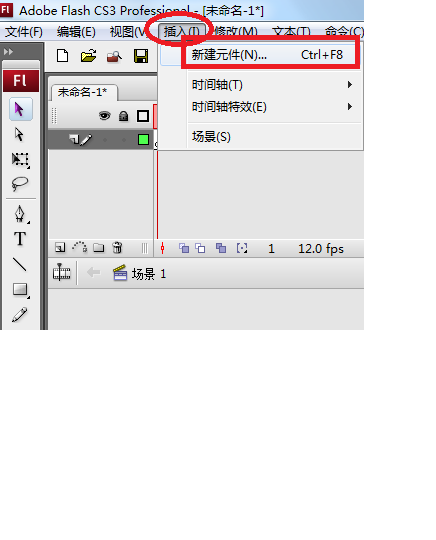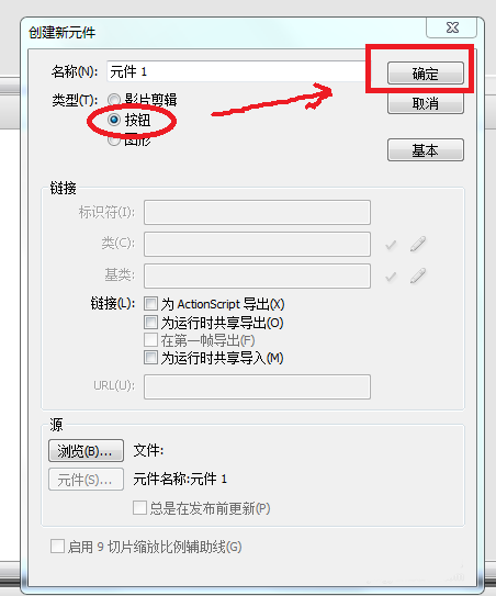 3、選擇“插入”>"新元件“命令,再打開的”創建新元件“對話框中選擇”按鈕“,然后點擊”確定“就創建好一個按鈕元件了。如圖所示。