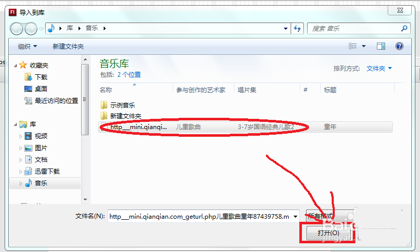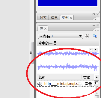 2、在打開的“導入到庫”對話框和選好聲音點確定,就會在庫面板顯示你導進來的聲音了。如圖所示。