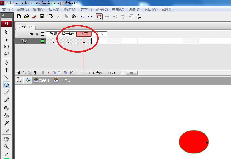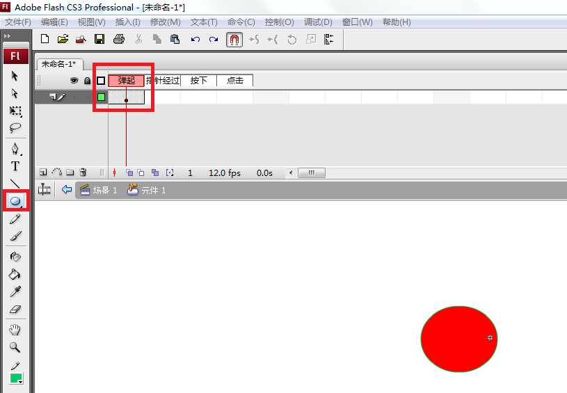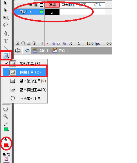 4、選中”彈起“幀,在工具箱中選中”橢圓“工具在顏色工具設置”紅色“,然后在舞臺中央繪制一個紅色橢圓圖案。如圖所示。