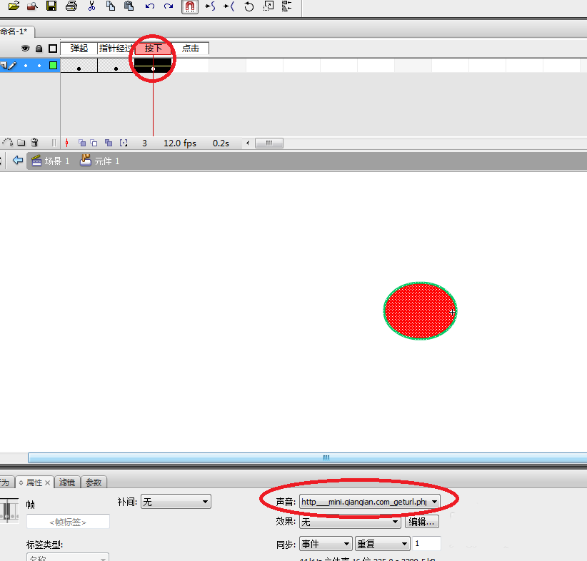 6、選中”按下“幀,在它的”屬性“面板上打開”聲音“,添加選擇聲音文件,此時時間軸上的”按下“幀上將顯示一條波段,表示添加聲音成功,如圖所示。