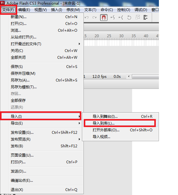 1、啟動Flash cs3程序,新建一個Flash文檔,然后選擇“文件”>“導入”>"導入到庫”的命令,導入聲音,如圖所示。