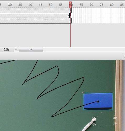 7、在黑板擦圖層的第60幀插入關鍵幀,然后將這幀上的黑板擦移到路徑的另一個端點,并且對齊同上。如下圖所示: