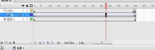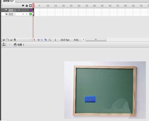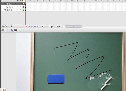 4、選中圖層2,用鼠標點擊時間軸下面的引導層按鈕,為黑板擦圖層創建一個引導層。然后在該圖層上繪制引導路徑。如下圖所示: