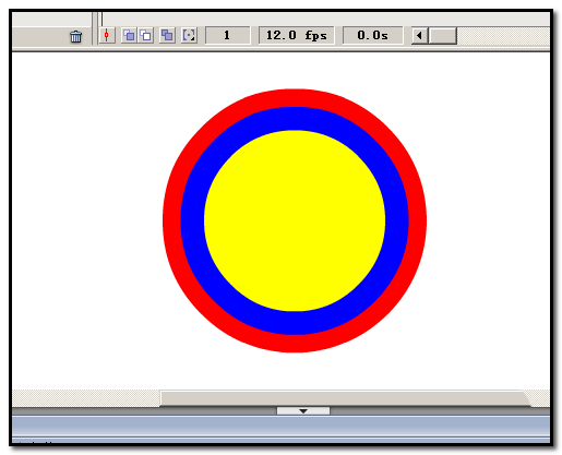 7、同樣方法,再新建圖層為圖層3,再畫出黃色的正圓;并居中于舞臺,與紅色、藍色兩圓中心點重合。