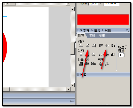 3、然后,按住鍵盤的SHIFT鍵,在舞臺上畫出一個大的紅色正圓。這時,正圓是在選中的狀態,在對齊面板這里,點“水平中齊”再點“垂直中齊”。