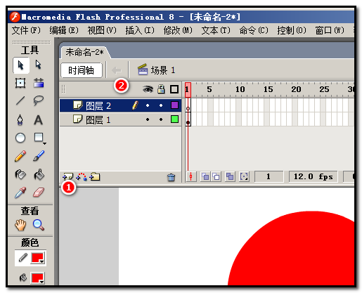4、點“水平中齊”再點“垂直中齊”后,舞臺上的正圓即上下左右居中于舞臺。在圖層面板,插入一個新圖層。為圖層2.