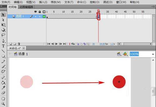 5、選中“圖層1”第30幀,把小球從舞臺的左邊拖到舞臺的右邊。