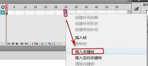 4、選中“圖層1”第30幀,單擊右鍵,在彈出的菜單中選擇“插入關鍵幀”。
