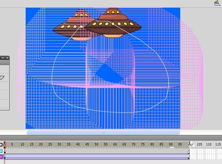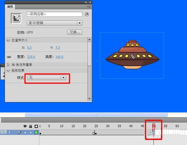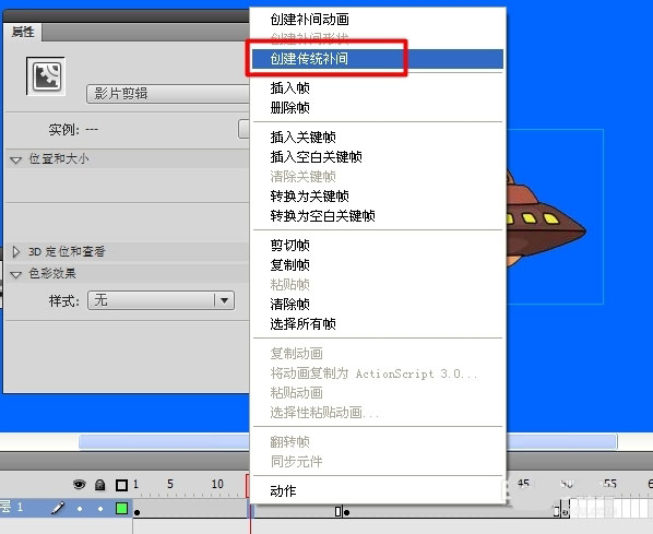 4、在50楨插入關鍵楨,將UFO設置成第一楨的效果,然后在兩個關鍵楨之間右擊,選擇“創建傳統補間”項。最終創建如圖所示的UFO閃爍效果。此步大家也可以根據需要進行自由創作。