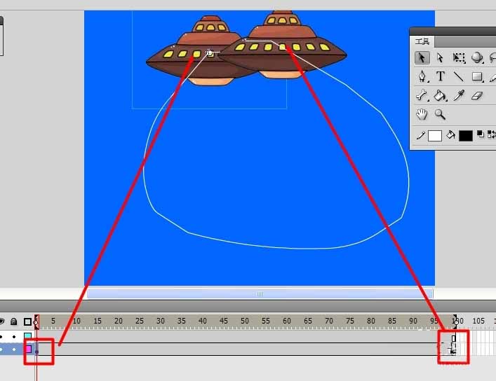 7、接著在100楨處插入關鍵楨,利用“選擇工具”分別將兩個關鍵楨處的物體移動到軌跡線的兩端。