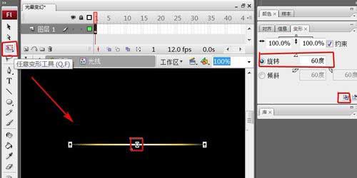18、選中“圖層1”第1幀,在“變形”面板里選擇“約束”,在水平縮放或垂直縮放里輸入縮放值為60%,然后按鍵盤中的“Enter鍵”確認。