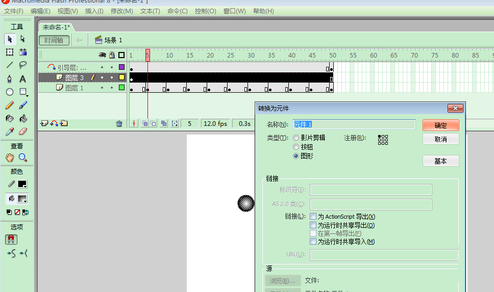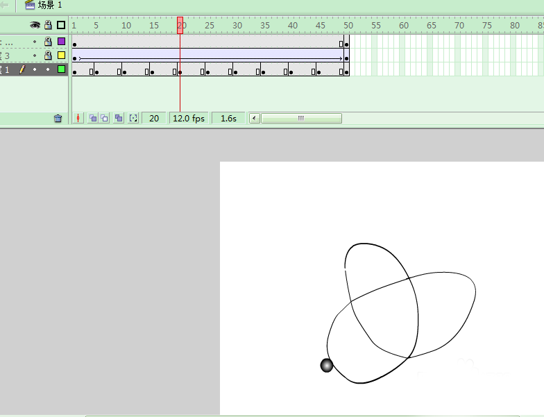 5、添加圖層3,繪制一個(gè)小球,轉(zhuǎn)換為元件;并且設(shè)置第50幀為關(guān)鍵幀,添加補(bǔ)間動(dòng)畫;