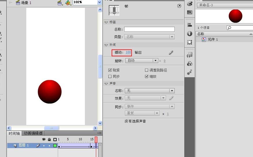 7、小球跳動就做完了,我們來設置一下上下小球的速度,小球下降時速度快,選擇屬性把緩動設置為負數,數值越大速度越快。相反,小球上升時速度慢,把緩動設成正數,數值越大越慢。