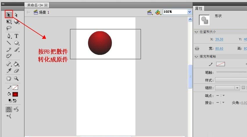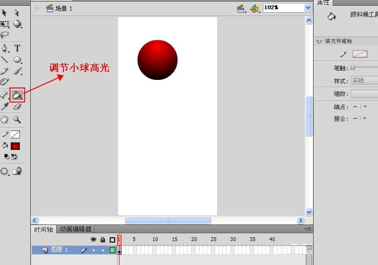 1、新建舞臺,設置200*400,按ctrl+2,把舞臺全屏。選擇漸變色,按shift畫出小球。