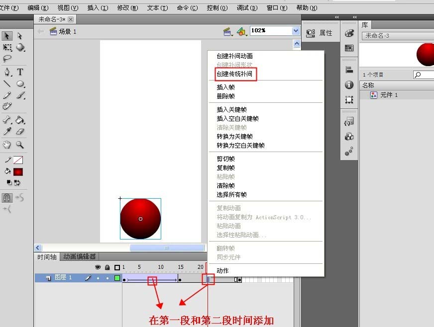 6、在第一段和第二段中間任何一段選擇任何一幀,右鍵插入創建傳統時間。