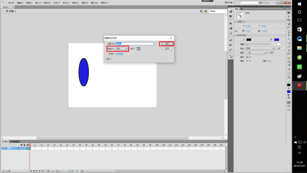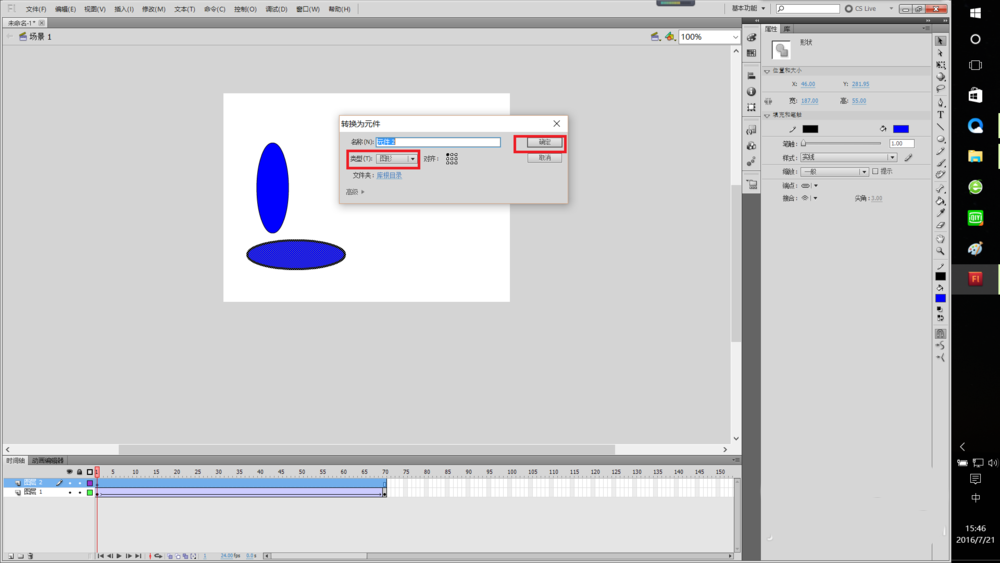 2、選中圖片,按"F8",進行元件制作,點擊“類型”,選擇所需要的類型,點擊“確定”,元件制作完成