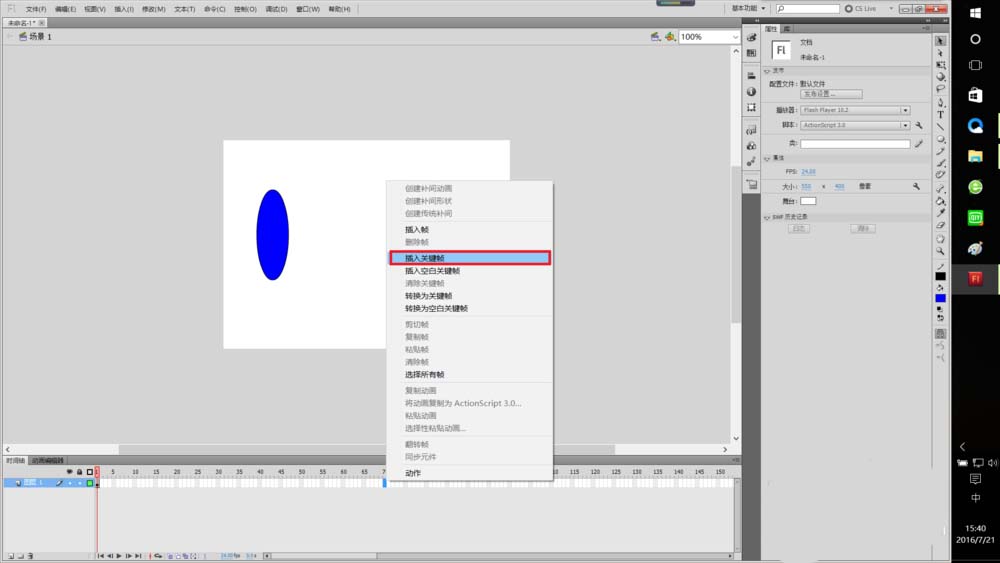 3、在時間軸上選擇一個幀,這里我選的是第70幀,右鍵,點擊“插入關鍵幀”