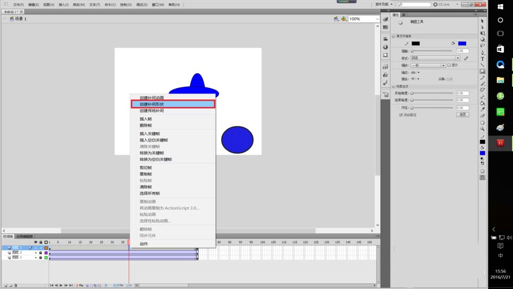 13、在第三圖層的時間軸上的第一幀到最后一幀的中間幀,任意選擇一幀,右鍵,點擊“創建補間形狀”
