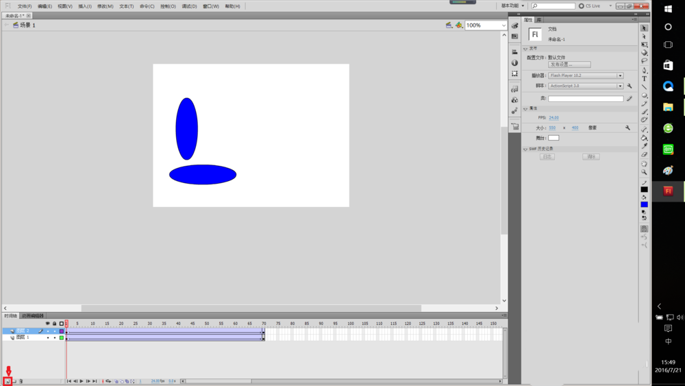 6、就會發現時間軸下的第一幀到最后一幀的中間有一條帶箭頭的直線,點擊左下角的“新建圖層”,建立第二個圖層