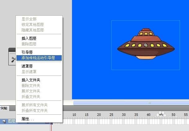 5、返回主場景,將“UFO閃爍”剪輯拖動到當前圖層,右擊圖層1,選擇“添加傳統運動引導層”。