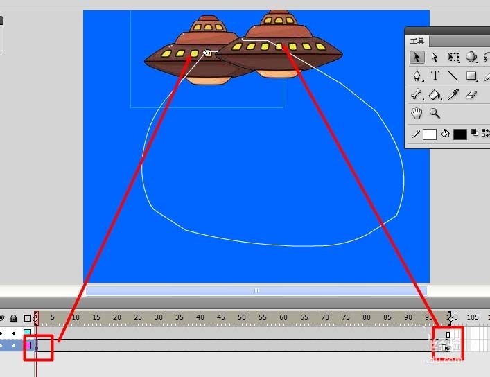 7、接著在100楨處插入關鍵楨,利用“選擇工具”分別將兩個關鍵楨處的物體移動到軌跡線的兩端。