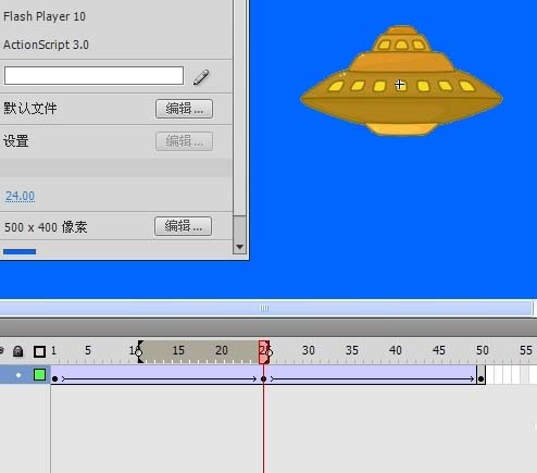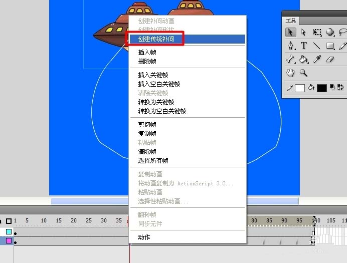 4、在50楨插入關鍵楨,將UFO設置成第一楨的效果,然后在兩個關鍵楨之間右擊,選擇“創建傳統補間”項。最終創建如圖所示的UFO閃爍效果。此步大家也可以根據需要進行自由創作。