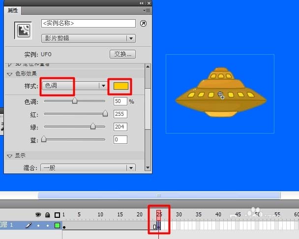 3、然后再利用同樣的方法創建一個名為“UFO閃爍”的影片剪輯。將“UFO”剪輯拖動到當前圖層,并在第25楨插入關鍵楨,打開“屬性”面板,改變其“色調”,效果如圖: