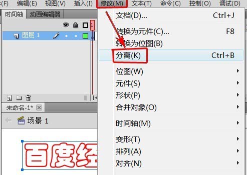 4、選中文字,在菜單欄中單擊“修改”,在彈出的下拉菜單中選擇“分離”