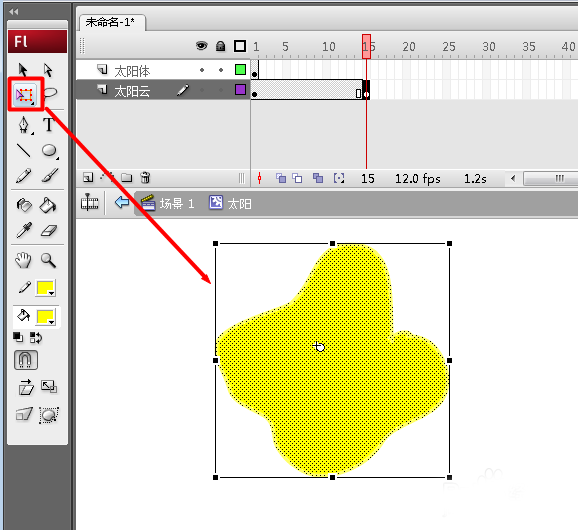 3、在“太陽云”第15楨右擊,選擇插入“關鍵楨”項,然后利用“變形”工具,對太陽云進行形狀變形。