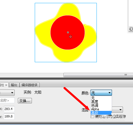 6、在第20楨右擊,插入“關鍵楨”。選中場景中的元件,在“屬性”面板中點擊“顏色”下拉列表,選擇“色調”項。