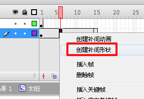 4、右擊“太陽云”兩關鍵楨之間,從彈出的菜單中選擇“創建補間形狀”項。