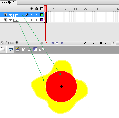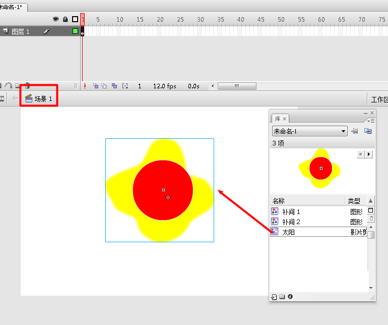 5、接著返回“場景1”,將“太陽”元件從庫拖動到此場景中。