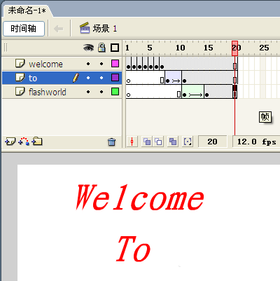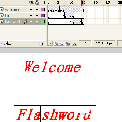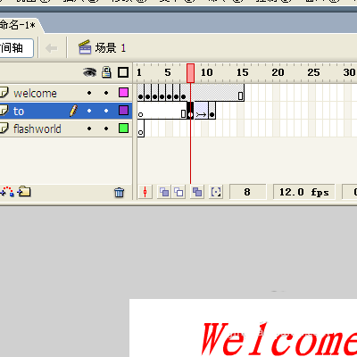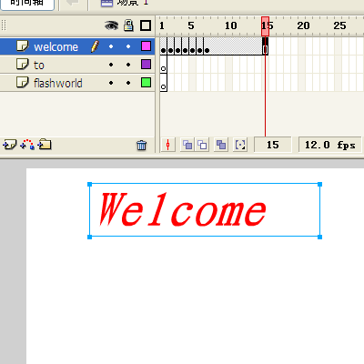 7、選中welcome層的第15幀,按下F5鍵(插入幀)。