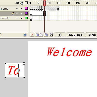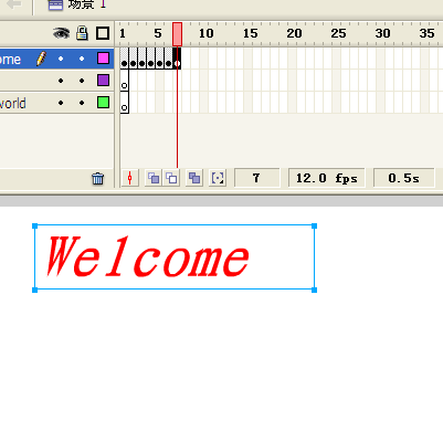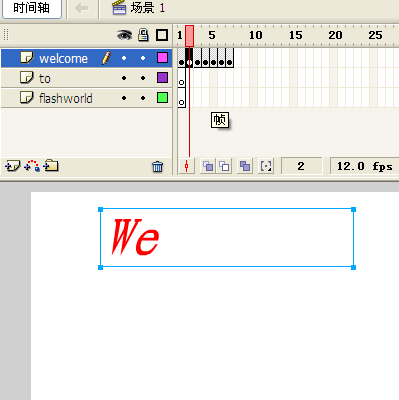 6、再次選中welcome的第一幀,雙擊"Welcome",刪除后面六個字母,只留下"W",如圖,用同樣的方法,第2幀留下"We",第3幀留下Wel,直到第7幀保留完整的Welcome。