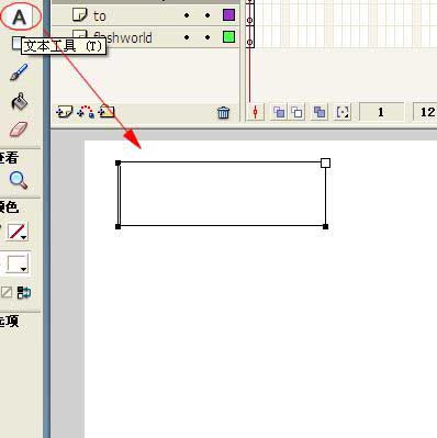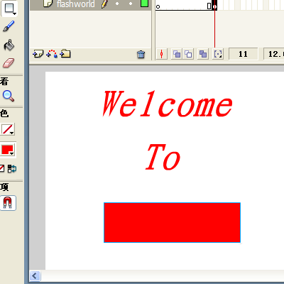 11、在flashworld層的11幀中插入關鍵幀。單擊工具箱中的矩形工具,在顏色面板中選取相應的顏色。再在舞臺中央畫出一個長條矩形。