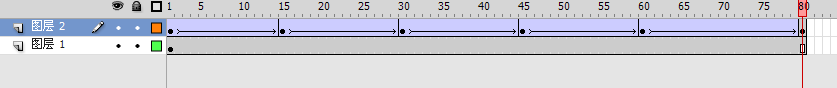 5、然后,在圖層二的15,30,45,60,80幀插入關鍵幀,并在幀之間創建傳統補間。