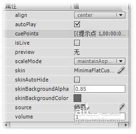 19、 在FLV文件“屬性”面板里微調。如果想進一步精雕細刻,還可以在屬性面板里詳細設置對齊方式、是否自動播放、設置腳本提示點、列表、模式、皮膚、音量,亦可更改數據源。方法是先點一下舞臺上的視頻實例,這時就會在窗口右邊出現屬性面板。如下圖。開始設置吧。