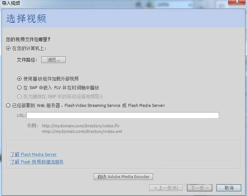 11、 使用組件加載外部FLV。在導入視頻窗口中,首先出現的是選擇視頻項,要求我們選擇視頻。因為在上一步我們采用了“拖放”的方法,所以已經解決了選擇視頻的問題。故,我們只要采用默認的模式就可以了。點窗口底部的“下一步”按鈕即可。