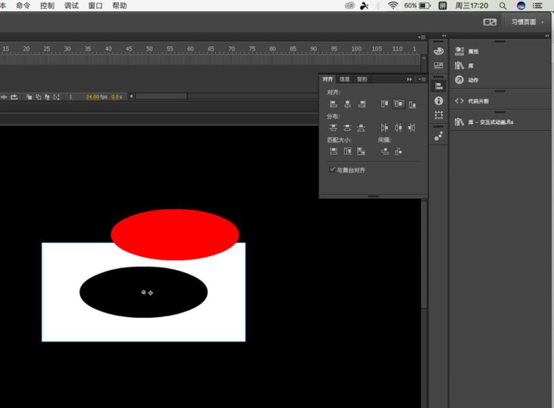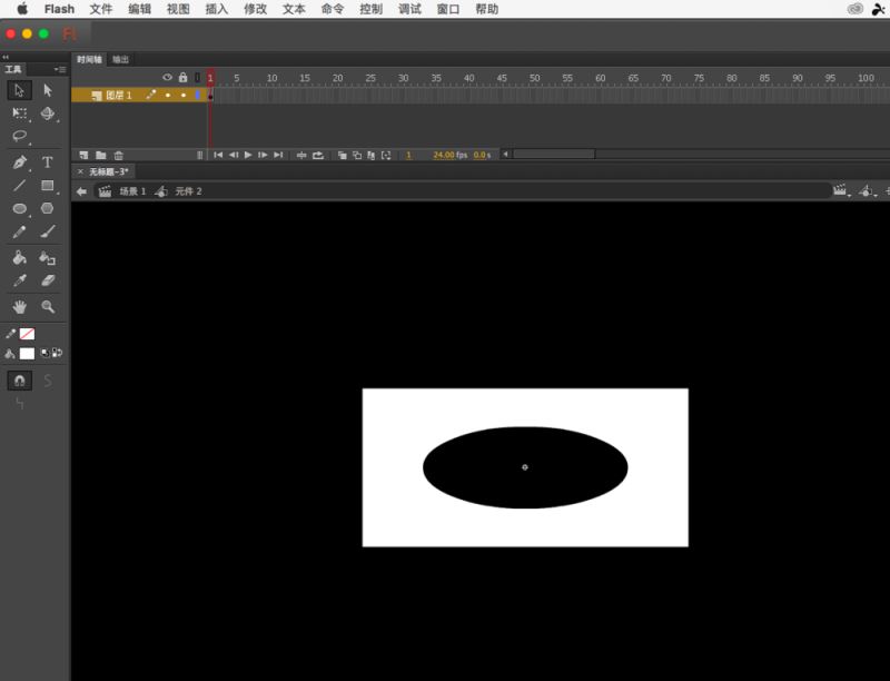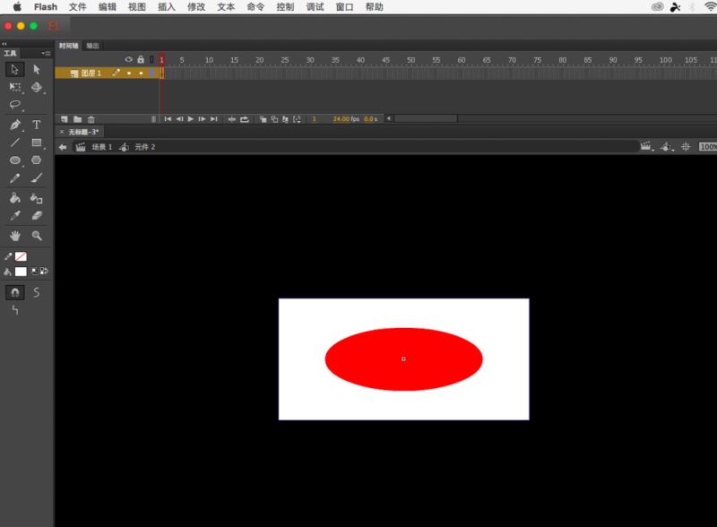 3、然后回到舞臺上,再次建立元件,還是圖形,這次畫一個矩形出來,比橢圓要大,然后把橢圓拖進去對齊到舞臺中央