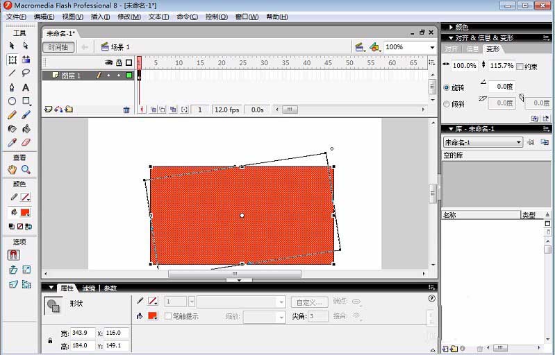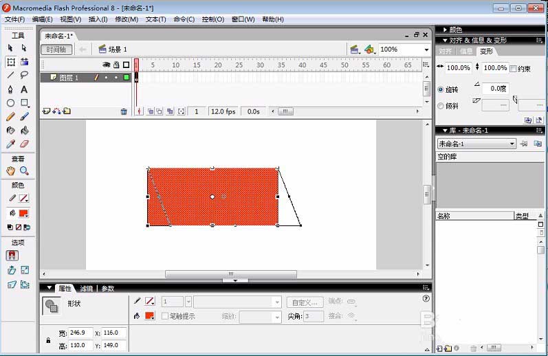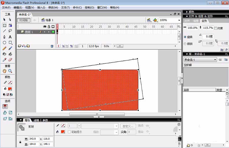 5、選中舞臺中的圖形,移動鼠標(biāo),當(dāng)鼠標(biāo)變成⇋時,可以變形成平形四邊形,即是水平方向變化。