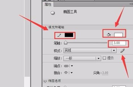 5、選擇橢圓工具,在屬性里調(diào)節(jié)筆觸顏色為黑色,填充色為白色,筆觸大小為3,如圖所示: