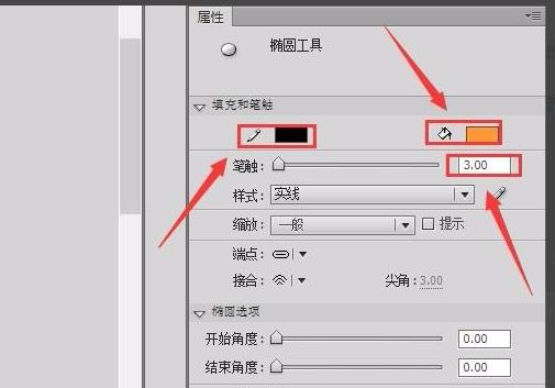 3、點(diǎn)擊橢圓工具,在右側(cè)的屬性里設(shè)置筆觸顏色為黑色,填充色為青黃色,筆觸大小為3,如圖所示: