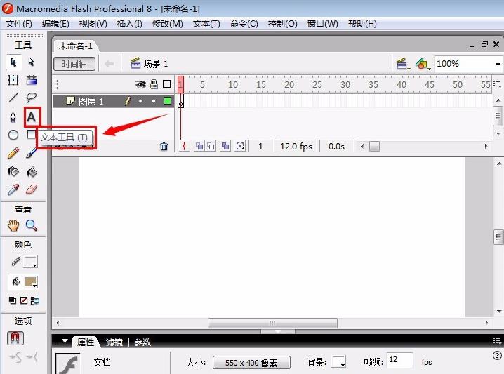 3、在左側工具欄中找到”A“,這是flash中的文字工具,如下圖所示: