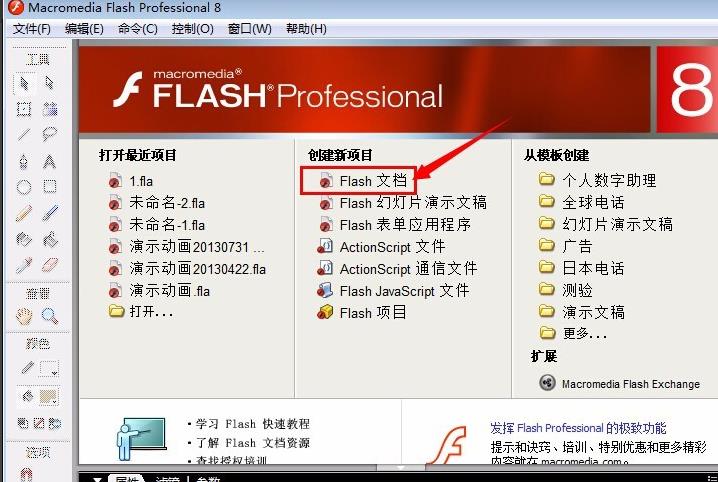 2、在中間”創建新項目“下,點擊”flash文檔“,創建一個新的文檔,如圖所示。