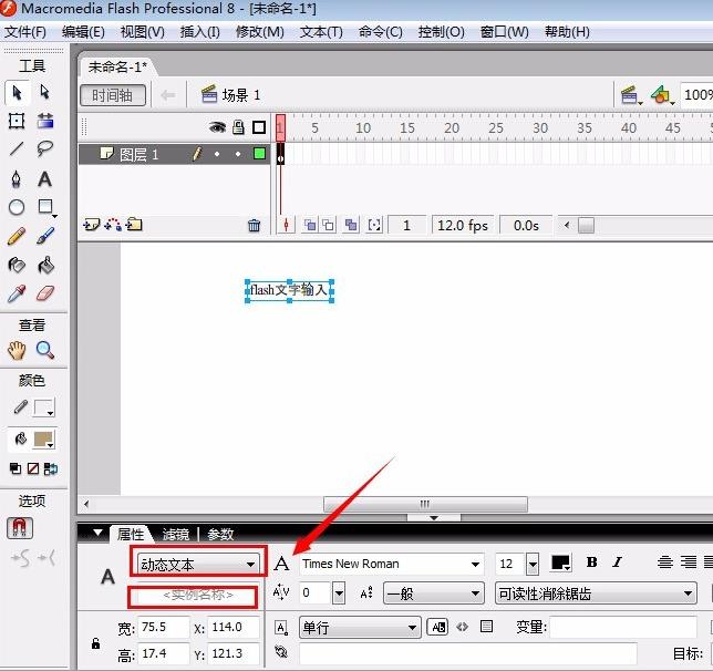 7、如果是動態文本的話,在屬性這里需要把靜態修改成”動態文本“。所謂動態文本,最后的內容是可以通過as腳本代碼來調用改變的。而動態文本后面是和案例相關聯的。