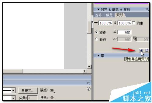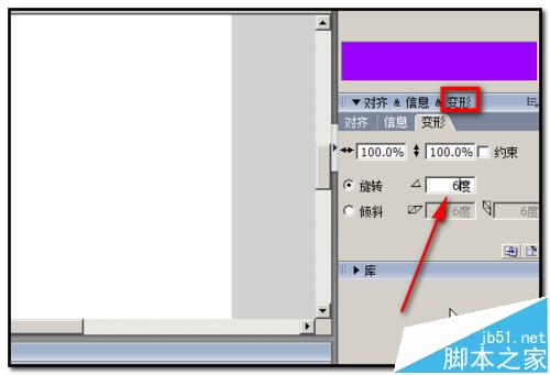3、再在舞臺右側這里點開“變形”面板;在面板這里的“旋轉”輸入框輸入6;