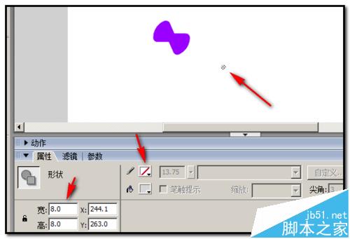 7、選中圖層2這里,然后,在舞臺上畫出一個筆觸為無顏色,高度和寬度都是8的小圓;
