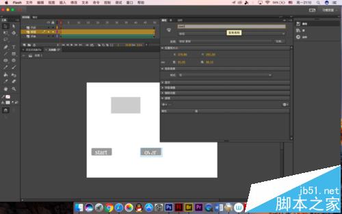 8、選擇代碼層,在編寫代碼之前還需要做一些準備工作,就是給按鈕命名,點擊start按鈕,來到屬性面板,實例名稱改為start,之后編寫代碼會用到