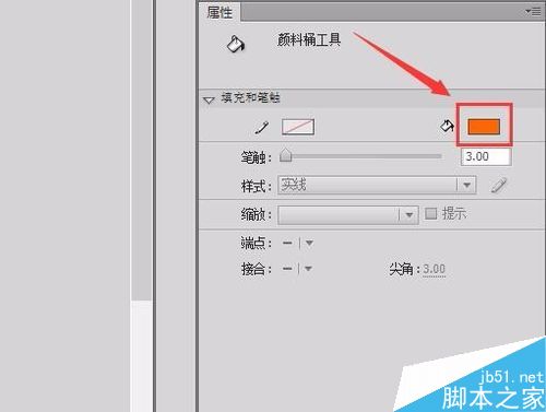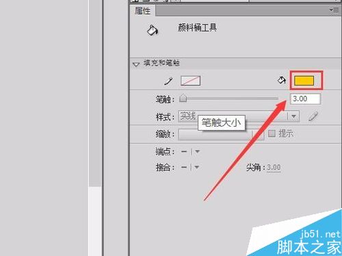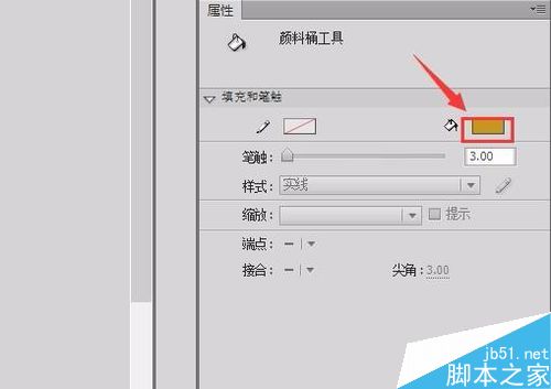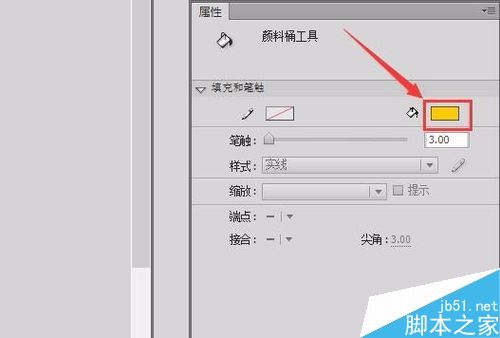 11、在工具箱里選擇油漆桶工具,在屬性里修改填充色為深一點的黃色,如圖所示: