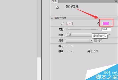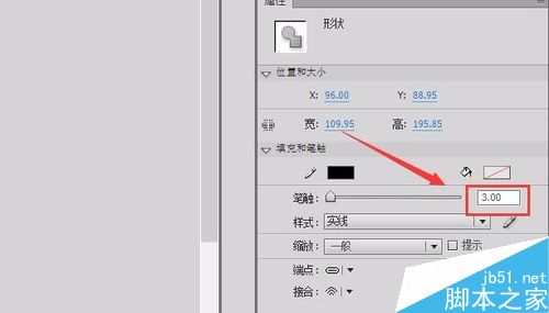 4、選擇繪制的曲線,在屬性里修改筆觸大小為3,如圖所示: